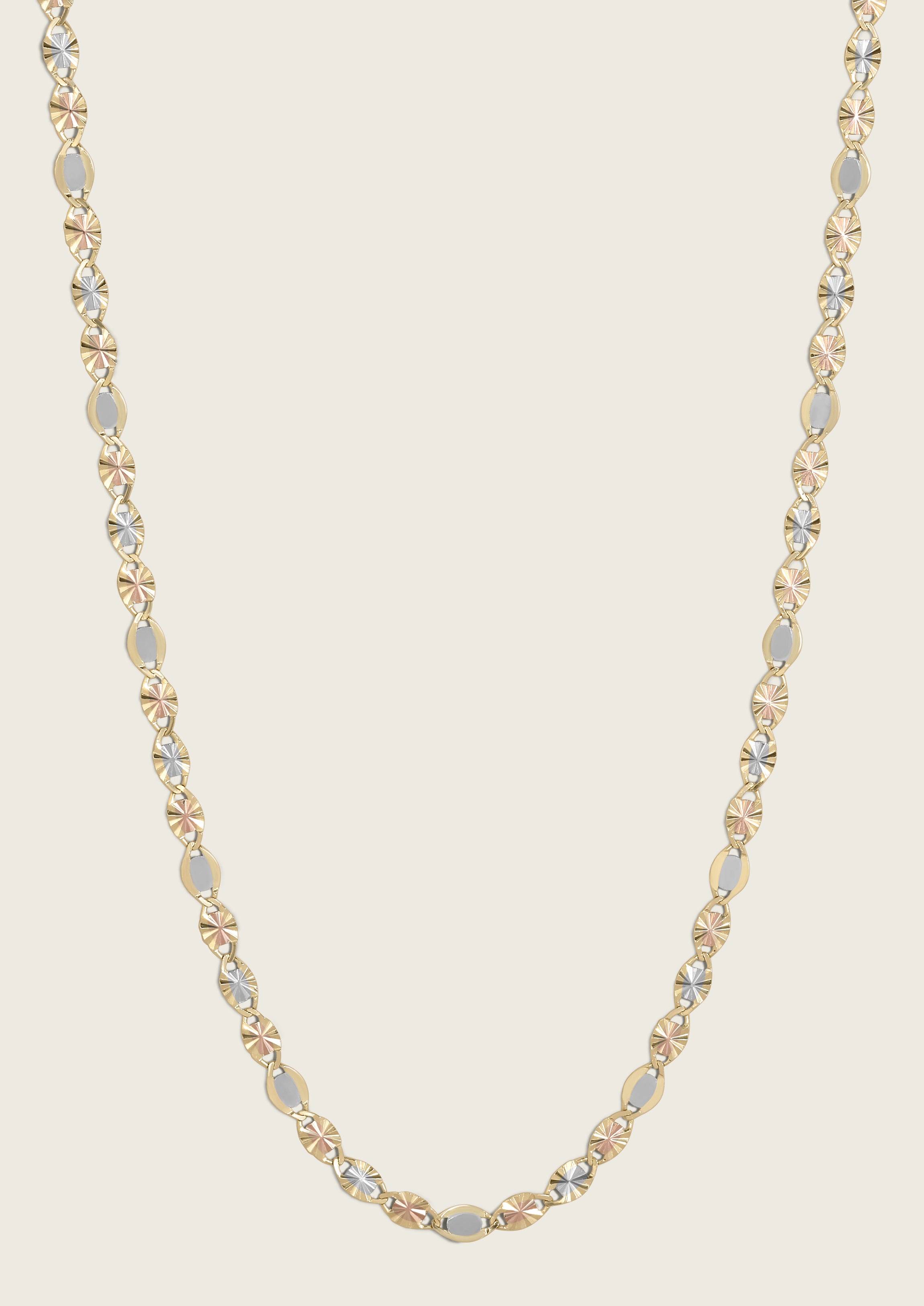 This highly detailed 14k tri-color gold valentino mirror chain features repeating white gold, yellow gold, and rose gold flattened oval links with shimmering diamond-cut mirror patterns, adding a total glamor to any look showcasing exquisite tri-color gold chain. Choose your preferred chain length from the menu. Closes with a lobster claw.